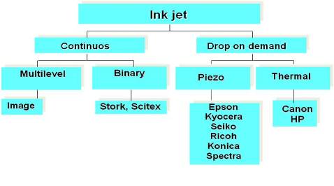 噴墨技術(shù)分為連續(xù)噴墨和按需噴墨(DOD)兩種,前者目前只用在柯達(dá)的數(shù)字印刷機(jī)上,市場(chǎng)上的絕大部分噴墨打印機(jī)都屬于按需噴墨技術(shù),按需噴墨又分為壓電和熱發(fā)泡兩類,熱發(fā)泡噴頭廉價(jià)、精度高,但其缺點(diǎn)也是顯而易見的:噴頭壽命短、只適用水性墨水,因之主要用于家庭和辦公室的紙張打??;而壓電噴墨是利用陶瓷加上電壓后會(huì)變形的原理,直接將電壓轉(zhuǎn)換為機(jī)械壓力,工作在常溫下,也無(wú)需溶解在水中的氧氣幫忙,所以不但噴頭壽命長(zhǎng),而且可以適用各種類型溶劑所生產(chǎn)的墨水。