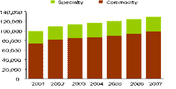 統(tǒng)計(jì)數(shù)據(jù)表明,美國(guó)家用電腦和打印機(jī)的普及培育了桌面噴墨打印的市場(chǎng),2004年噴墨方式輸出的1160億張打印紙中,特殊打印介質(zhì)將近300億張,預(yù)期2002年至2007年間普通噴墨打印紙和特殊打印介質(zhì)均會(huì)有穩(wěn)定增長(zhǎng),這段時(shí)間內(nèi),噴墨打印介質(zhì)的打印數(shù)量年度遞增率(CAGR)為3.5%。2004年美國(guó)整個(gè)噴墨介質(zhì)的收入超過32億美元,其中普通產(chǎn)品約17億美元,透明片或其它膠片薄膜產(chǎn)品0.5219億美元,特殊打印介質(zhì)超過13億美元。雖然普通產(chǎn)品(commodity)仍是噴墨打印的主要輸出對(duì)象,數(shù)量上占了總噸數(shù)的75%,但由于價(jià)格低,其銷售額只占總銷售額的40%。 2005年預(yù)期桌面噴墨打印的總量將超過1202億張,市場(chǎng)份額33億美元。2002-2007年間預(yù)期噴墨打印紙的銷售額年遞增率2.4%。特殊打印介質(zhì)包括彩噴紙(Coated paper),照片打印紙(Photo paper),明信片紙,背膠,油畫紙,標(biāo)簽紙等等。在特殊打印介質(zhì)的增長(zhǎng)中,彩噴紙的增長(zhǎng)速度相比較慢,而照片打印紙?jiān)鲩L(zhǎng)速度很快,預(yù)計(jì)2002-2007年間照片打印紙的年遞增率將高達(dá)16%!這種增長(zhǎng)歸功于低價(jià)位數(shù)碼相機(jī)的熱銷;低于50美元打印機(jī)的銷售;和數(shù)字圖像傳輸?shù)目旖菪浴?/span>