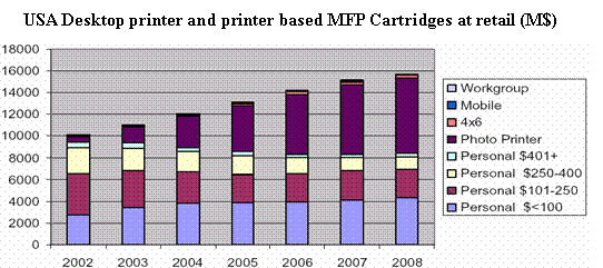 從全美零售市場(chǎng)的數(shù)據(jù)分析, 2003-2008年噴墨墨盒的零售總額年遞增率約8%,其中照片質(zhì)量墨盒的銷售量呈增長(zhǎng)勢(shì)頭強(qiáng)勁。由于照片噴墨打印機(jī)和具備照片彩色打印的MFP可能使用同一型號(hào)墨盒,統(tǒng)計(jì)將兩者合并。普通噴墨MFP也和對(duì)應(yīng)的普通個(gè)人型打印機(jī)合并。數(shù)據(jù)顯示,2003年用于照片打印的墨盒零售總額19.10億美元,占全年零售總額(107.2億美元)的17.8%, 比02年的6.90億美元增加了177%。2008年, 預(yù)期用于照片打印的墨盒零售總額可達(dá)73.10億美元。對(duì)于普通的中高端墨盒零售額,由于受到價(jià)格下降和激光打印輸出方式的影響,03年到05年間有明顯下降,05年至08年基本保持不變。而低端的噴墨墨盒一直穩(wěn)中有升。