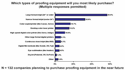 2004年1月市場(chǎng)研究公司InfoTrends發(fā)表的CAP ventures和“Digital Output Magazine” 聯(lián)合開展的公司用戶調(diào)查結(jié)果,回答近期內(nèi)公司準(zhǔn)備采購何種數(shù)碼打印設(shè)備時(shí),56.8%的公司準(zhǔn)備采購超過24英寸的寬幅噴墨打印機(jī),32.6%的公司準(zhǔn)備采購桌面噴墨打印機(jī),桌面彩色激光打印機(jī)的采購傾向用戶15.2%, 可見噴墨在該領(lǐng)域占主導(dǎo)地位,這種狀況在一定時(shí)間內(nèi)延續(xù)下去。