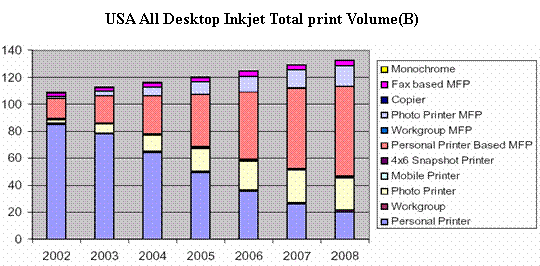 2004年11月15日InfoTrends研究機(jī)構(gòu)發(fā)表的市場(chǎng)調(diào)查結(jié)果表明,2003年美國(guó)共安裝了超過8300萬臺(tái)桌面噴墨打印設(shè)備,使得噴墨成為桌面打印的主要輸出方式。其中,照片噴墨打印機(jī)裝機(jī)量482萬臺(tái),比02年增加39%。在這里所謂照片打印機(jī)(Photo Printer),是指同時(shí)具備照片級(jí)彩色輸出性能,數(shù)碼相機(jī)存儲(chǔ)卡插槽,照片級(jí)墨盒三種典型特征的打印機(jī)。多功能一體機(jī)(MFP, multifunctional printers or imaging devices)是將打印,掃描,傳真,復(fù)印等功能復(fù)合一體的設(shè)備,其增長(zhǎng)的速度也非常快,2003年裝機(jī)量1585萬臺(tái),比02年的1085萬臺(tái)增長(zhǎng)46%。其中部分MFP除打印,掃描,傳真功能外,還具備照片彩色打印功能,這種增長(zhǎng)同時(shí)也大大提高了特殊打印介質(zhì)(specialty media)的需求。Infotrends預(yù)期到08年,照片噴墨打印機(jī)的年裝機(jī)量可達(dá)1890萬臺(tái),占總裝機(jī)量的18%,普通MFP高達(dá)4800萬臺(tái),占總裝機(jī)量的45%,帶照片彩色打印功能的MFP1160萬臺(tái),占總裝機(jī)量的11%。而普通型個(gè)人噴墨打印機(jī)(Personal Pinter)的裝機(jī)量呈逐年下降趨勢(shì),數(shù)據(jù)表明2003年比02年下降了4.3%,普通個(gè)人噴墨打印機(jī)所占比例也逐年減少,預(yù)期08年僅占15%以下。2003-2008年間,噴墨打印機(jī)的總裝機(jī)量CAGR 為5%。