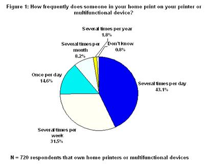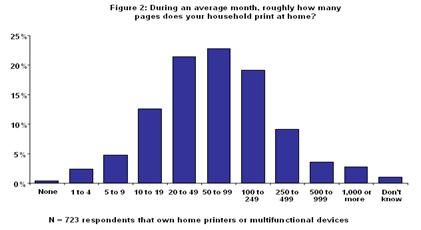 2003年8月CAP Ventures 通過對(duì)全美網(wǎng)上擁有家庭打印機(jī)的用戶進(jìn)行打印習(xí)慣調(diào)查,共有超過700名用戶參與調(diào)查并做有效回答,用戶使用打印機(jī)的頻率和打印張數(shù)下圖所示: