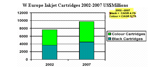 CAP Ventures 2003年對(duì)西歐市場(chǎng)的調(diào)查結(jié)果顯示,2002-2007年間,預(yù)期彩色噴墨墨盒的銷售數(shù)量年遞增率將達(dá)6.5%, 從2002年的1.26億個(gè)增加到2007年的1.72億個(gè)。而黑墨墨盒的年遞增率4.8%, 略低于彩墨增長(zhǎng)率。銷售額的年遞增率則為黑墨 4.1%,彩墨5.7%。2002年彩墨墨盒的銷售額約40億美元,2007年可望達(dá)到52億美元。