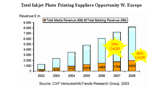 耗材方面2003年西歐市場(chǎng)照片噴墨打印介質(zhì)的收入為6.15億歐元,而整個(gè)照片打印介質(zhì)加墨水的收入為17.13億歐元。 2008年照片打印介質(zhì)收入預(yù)期可達(dá)19.70億,CAGR高達(dá)26%。照片介質(zhì)加墨水銷售收入可望達(dá)62.05億歐元,CAGR29%。