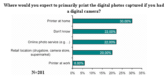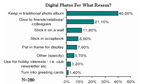 至于影像的輸出問題,兩種不同的打印方式同時(shí)占據(jù)市場(chǎng)并共同發(fā)展。一是用戶自己在家打印,從拍攝到輸出,全部自己搞掂。第二是通過專業(yè)連鎖店(在線或不在線)或零售打印店打印“照片”。對(duì)于輸出的影像,40%的用戶仍象傳統(tǒng)感光照片一樣將之保存在相冊(cè)中,21.1%的用戶將照片贈(zèng)給親友或同事。