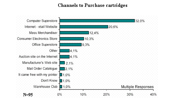 調(diào)查機(jī)構(gòu)發(fā)現(xiàn):用戶購買照片墨水和介質(zhì)的渠道有較大區(qū)別,雖然電腦超市都是用戶最常去的場(chǎng)所,但墨水的銷售很多是通過Internet和大型超市實(shí)現(xiàn)的,而介質(zhì)通過Internet網(wǎng)的銷售方式僅排第5位,大量用戶選擇在大型超市、辦公品商場(chǎng)購買。用戶選擇在辦公品商場(chǎng)購買墨水的比例僅占9.3%。上述區(qū)別的原因可能是:用戶對(duì)墨水品質(zhì)保證的關(guān)注程度高于介質(zhì),顯而易見相比于介質(zhì),墨水對(duì)打印機(jī)可能能造成更大的傷害。