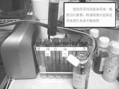 3.打印機使用連續(xù)供墨系統(tǒng)以后的日常保養(yǎng)工作不可忽視以下幾點:①打印機擺放位置不能被日光直接照射,同樣,外墨盒盡量不要長期被紫外線照射,以免外墨盒墨水保存時間縮短,如果受使用條件的限制,可以將外墨盒做遮光處理或者選用外墨盒有防紫外線盒子的連續(xù)供墨。②外墨盒上都有通氣孔,打印機的使用環(huán)境就需要注意防塵工作。③打印機不能長期不使用。噴頭在打印中是否有斷線,與氣候、環(huán)境、墨水質(zhì)量、自身狀況等都有關(guān)系,最好每半個月至少使用1次,氣候特別干燥的地區(qū)每周至少使用1次,如確實無打印任務(wù),可以打開打印機電源后,打印一張噴嘴檢查圖以便確定噴嘴狀況。④外墨盒再次添加墨水方法按照說明書操作即可,需要注意的是打印機外墨盒的墨水最好不要使用一點就馬上添加,墨水存放有一個保質(zhì)期,每色使用到一定極限再添加為好;添加墨水的時候也要注意不要加得過滿,更不能添加錯顏色(圖14)。⑤不同牌子的墨水不要混用,如果要換其他牌子墨水,應(yīng)將外墨盒中的墨水抽干后再更換,顏料墨水和染料墨水之間需要互換,應(yīng)當先將整個連續(xù)供墨系統(tǒng)的墨水都抽干凈并進行清洗。