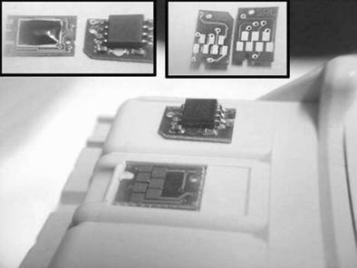 二是墨盒芯片對位不準確沒有被打印機檢測到。目前國內(nèi)永久芯片沒有一個統(tǒng)一標準,比如芯片的體積大小和厚薄,當更換另一種芯片后,由于體積大小和厚薄的不一致,造成打印機無法檢測到芯片;還有一些內(nèi)墨盒上芯片放置位置做工上的精確度不高,這樣就或多或少影響到芯片在墨盒上的固定點的精確度;當然墨盒標準尺寸不夠也會造成與打印機的彈簧接觸點對位不準,使打印機無法檢測到永久芯片(圖13)。