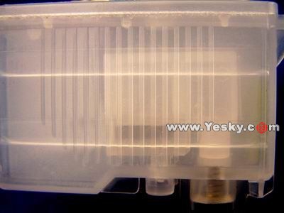 無(wú)海綿墨盒側(cè)面圖,里面有一個(gè)墨水壓力平衡倉(cāng),可以起到平衡墨水的作用,使得打印頭承受的壓力更為均衡。