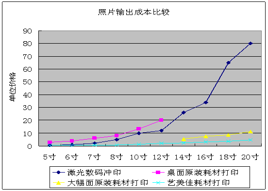從上圖就可以看出,照片打印機(jī)和基于照片打印的多功能打印機(jī),每年都以30%以上的速度增長,僅美國市場,2005年預(yù)計裝機(jī)量就達(dá)到2000萬臺以上,2008年可達(dá)3000多萬臺。 相比于數(shù)碼激光,照片的噴墨打印輸出至少有如下優(yōu)勢:方便、隨意性強(qiáng):因為完全在家庭、辦公室實(shí)現(xiàn),可大可小、可多可少,隨時隨地、隨心所欲。私密性好:用不著將數(shù)碼文件交給別人,也用不著從他人處取回,不想讓人見的,別人永遠(yuǎn)見不到。DIY,樂趣無窮:不管是對于專業(yè)人士,還是對于數(shù)碼發(fā)燒友,完全可以陶醉于從拍照、編輯修改到打印輸出的無窮樂趣。環(huán)保:不再用銀鹽等稀缺資源,也擺脫了藥水使用與排放對于環(huán)境的污染。持久不退色:噴墨打印墨水分為染料和顏料兩大類,如果使用顏料墨水打印出的照片,比傳統(tǒng)的銀鹽感光照片能夠保存更長的時間而不退色。 噴墨打印技術(shù)不斷發(fā)展,墨水和打印介質(zhì)品質(zhì)也在不斷提高,從技術(shù)的角度來看,水性顏料墨水+RC間隙型防水高光相紙是照片噴墨的主流方向。不但質(zhì)感、影像品質(zhì)方面毫不遜色于銀鹽感光照片,而且在光線耐牢度、方便性、設(shè)備投入等方面明顯優(yōu)于感光照片。 可能唯一的問題是成本,有的人會抱怨,噴墨打印的成本高,是的,以EPSON照片級噴墨打印機(jī),打印在原裝EPSON高質(zhì)量光澤照片紙上為例,打印一張6寸的照片,成本會在3元以上,而在外面的沖印店里,激光數(shù)碼沖印的報價只有一塊左右。定位于專業(yè)應(yīng)用的大幅面打印機(jī)打?。?4英寸到44英寸寬)成本會低很多,因為桌面打印機(jī)墨盒中的墨水,平均每毫升價值10塊人民幣左右,大幅面打印機(jī)墨盒的容量更大,平均每毫升2元上下。從下圖就可以看出,用專業(yè)大幅面打印機(jī)打印照片,成本就已經(jīng)遠(yuǎn)遠(yuǎn)低于激光數(shù)碼沖印的價格,但是這些打印機(jī)并不是給家庭使用的,像激光數(shù)碼沖印一樣,是給專業(yè)的影像服務(wù)機(jī)構(gòu)使用的。